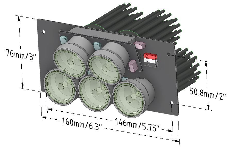 Supplied un-assembled as the completed light PCB, heatsinks and collimating lens, the light requires about 20 minutes of assembly time. (Just one screwdriver required!)